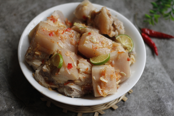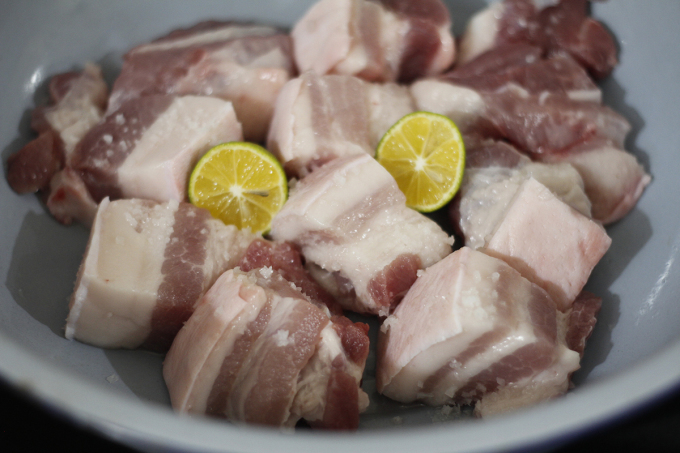 Thịt ba chỉ (ba rọi) cạo sạch, cắt miếng vuông 4 - 5cm (nếu thích to hơn thì bạn thái miếng to). Chà muối hạt và chanh khử mùi, rửa sạch.