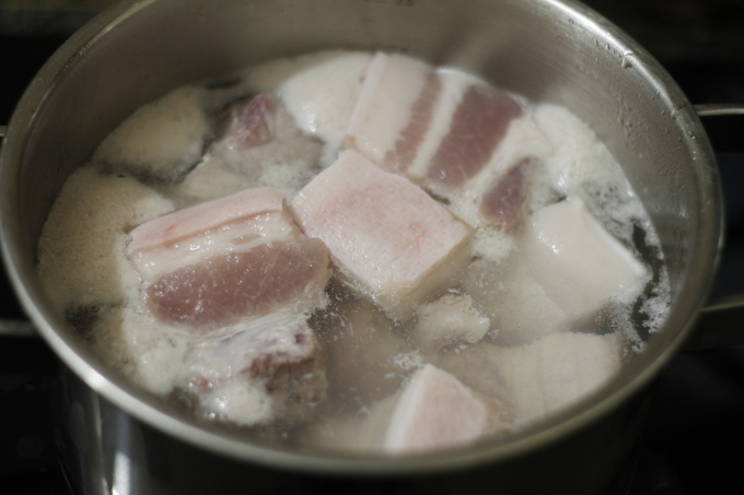 Chần sơ thịt với nước sôi để loại bỏ tạp chất, vớt ra, rửa nhiều lần cho sạch rồi để ráo nước/hoặc thấm khô.