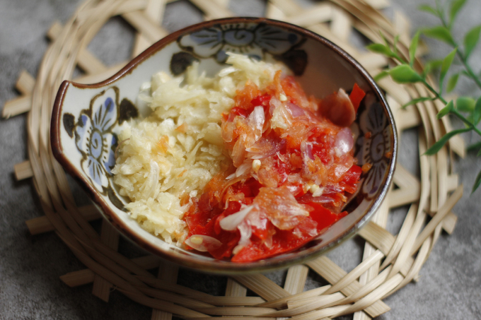 Giã nát tỏi, ớt và hành khô để tiết ra tinh dầu giúp khi ướp thịt được thơm ngon hơn.