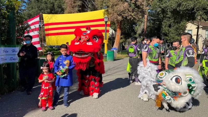 Đội múa lân trong hội chợ tết ở Kelly Historical Park, San Jose