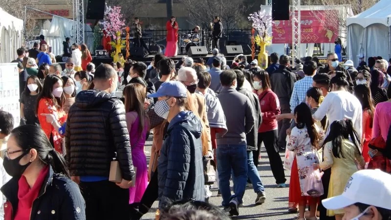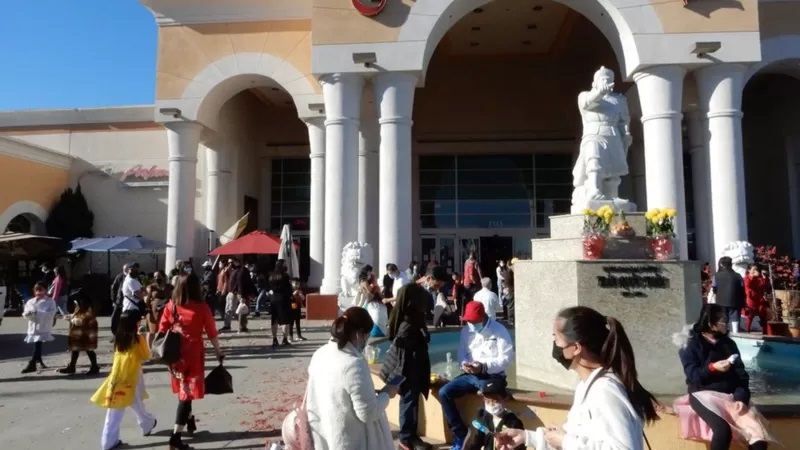 Không khí đi mua sắm tết cũng không quá ảm đạm. Mấy bàn ăn đông khách ngồi ngoài trời dưới nắng Cali ấm áp, chẳng bù cho bão tuyết đang đổ ngập xuống bên bờ đông nước Mỹ. Người đi mua sắm qua lại bên hàng áo dài, hàng bán bánh kẹo. Bánh chưng 20 đô một chiếc, 15 đô một đòn bánh tét.