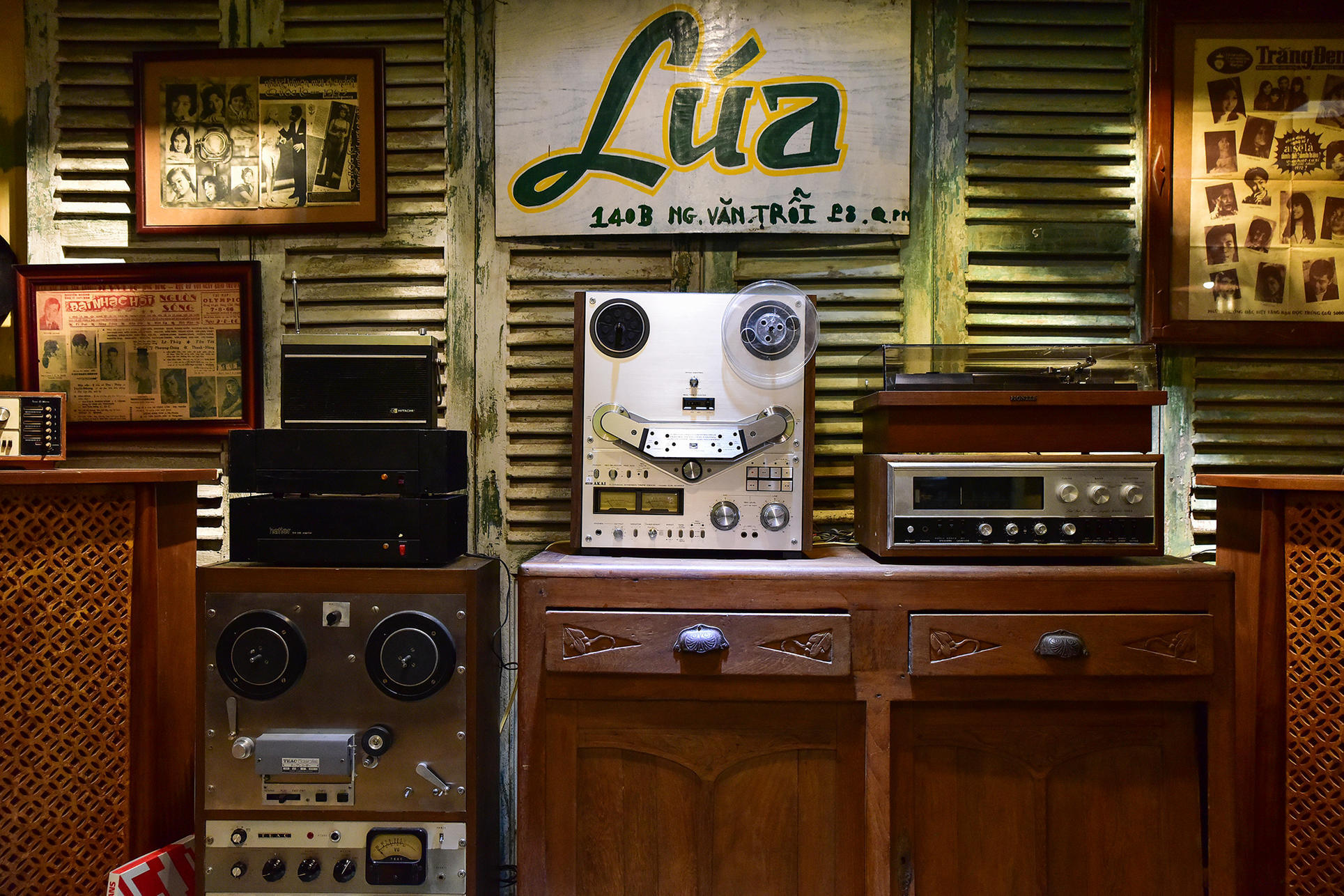 Những dàn máy nghe nhạc, máy chiếu phim, tivi, đài cassette, máy hát loa kèn cổ điển, điện thoại bàn, máy ảnh… của nhiều hãng được trưng bày. Trong đó dàn máy băng cối Akai phổ biến những năm 60, máy chiếu vẫn còn sử dụng hàng ngày trong quán.