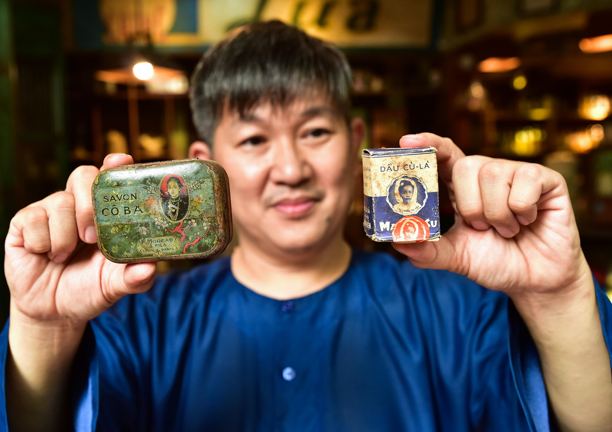 Nằm bên cạnh chạn gỗ là tủ kính cũ cất giữ nhiều vật dụng quen thuộc, hầu như đều có trong gia đình người Sài Gòn xưa như xà bông Cô Ba từ 1920, dầu cù là Mac Phsu, lon sữa Guigoz, cờ domino, ly nước… Nổi bật và giá trị nhất là chiếc hộp đựng xà phòng Cô Ba - thương hiệu nổi tiếng với người Việt những năm đầu thế kỷ 20.