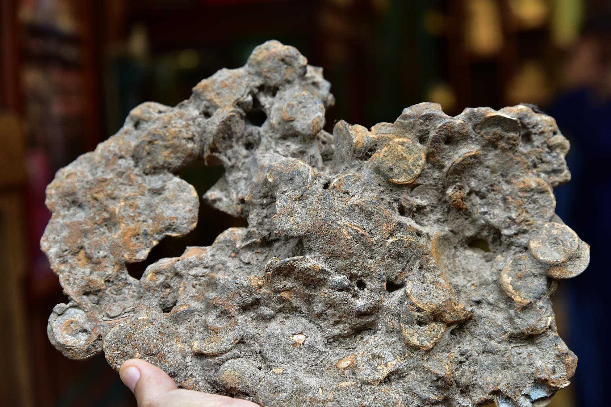 Theo ông nhà sưu tập, tiền xưa thường được chôn trong chum, vại trong thời gian dài nên các đồng dính chắc vào nhau tạo thành khối lớn cứng như đã, có hình thù lạ, rất khó gỡ ra. Dân chơi đồ cổ thường gọi đây là “tiền hoá thạch” vì rất hiếm. Khi mua về, tìm được ông để nguyên dạng, bởi nếu gỡ rời ra thì dễ hỏng và mất giá trị ngay.