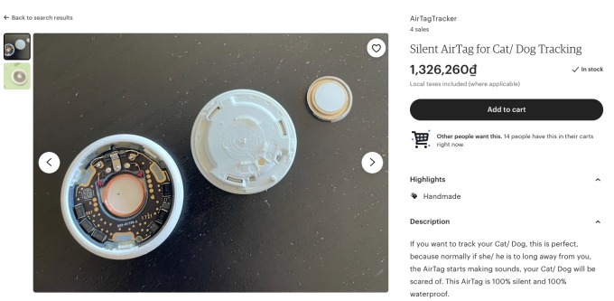 Một mẫu "Silent AirTag" trên Etsy đươc mô tả với mục đích theo dơi chó mèo.