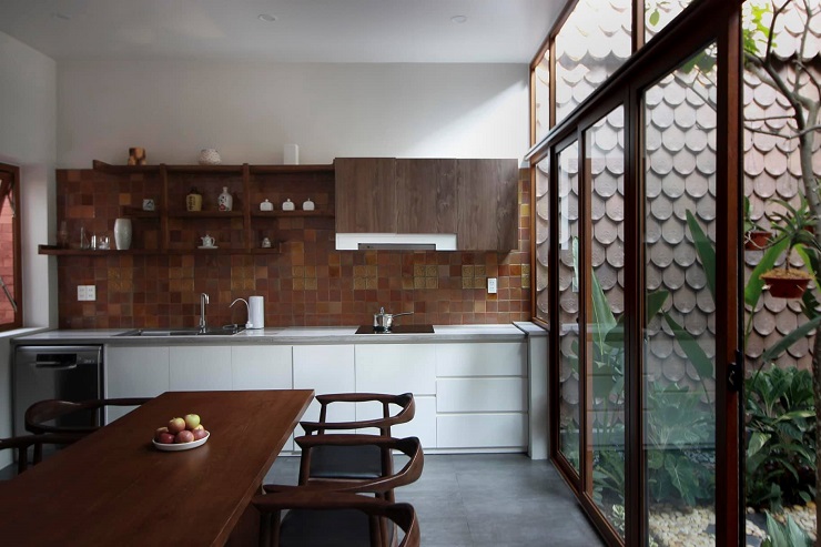 Phòng bếp - ăn là không gian nối tiếp với sân trong của công trình, bởi vậy khu vực này cũng tràn ngập ánh sáng và khí tươi. Khu vực bếp nấu được đặt sát với sân trong, khi nấu nướng gia chủ chỉ cần mở cửa trượt sân trong giúp mùi đồ ăn được phân tán hiệu quả.