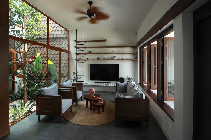 Toàn bộ kết cấu không gian xốp của ngôi nhà như hàng hiên, sân trong, vườn sau nhà hay lệch tầng đều góp phần tạo nên hiệu quả thông gió, tối ưu ánh sáng tự nhiên, đồng thời tạo nên sự ấm cúng, gần gũi cho không gian đậm kiến trúc truyền thống. Nhờ cách thiết kế như vậy, các thành viên trong nhà có sự kết nối với nhau ở bất kỳ vị trí nào, mà vẫn đảm bảo sự riêng tư.