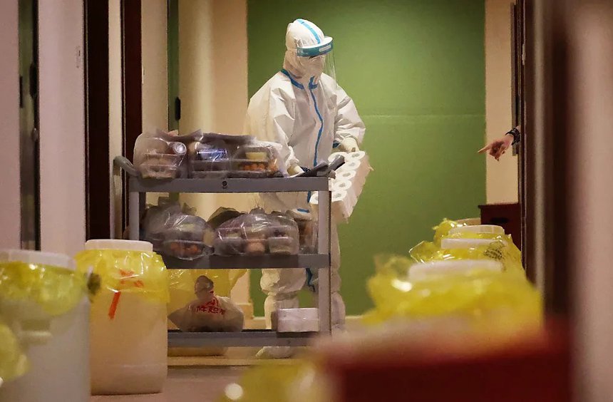 Một t́nh nguyện viên đang phân phát thức ăn nhu yếu phẩm bên trong khách sạn Shuanglong, nơi được dùng làm cơ sở cách ly trong thời gian diễn ra Olympic Bắc Kinh 2022. Ảnh: Getty.