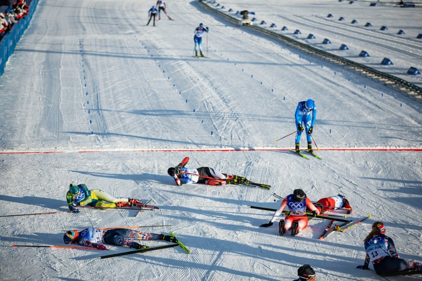 Các vận động viên gục ngă khi kết thúc nội dung thi trượt tuyết băng đồng tại Olympic Bắc Kinh ngày 5/2. Ảnh: Guardian.
