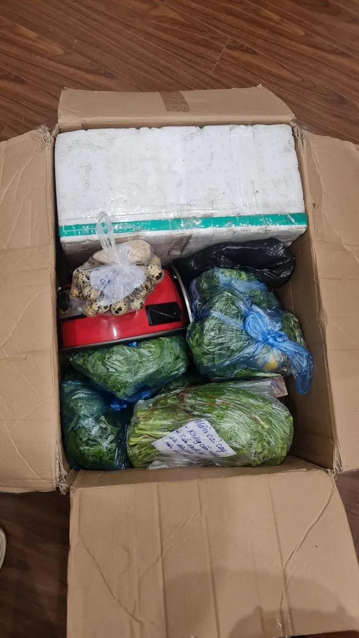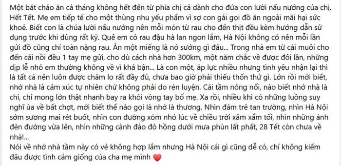 “Hết Tết, mẹ em tiếp tế cho một thùng nhu yếu phẩm vì sợ con gái gọi đồ ăn ngoài mãi hại sức khỏe. Biết con là chúa lười nấu nướng nên mỗi món từ rau cho đến thịt đều kèm hướng dẫn sử dụng trước khi dùng rất kỹ. Quê em có rau đậu hà lan ngon lắm, Hà Nội không có nên mỗi lần gửi đồ cũng chỉ toàn nặng rau. Ăn một miếng là nó sướng gì đâu...