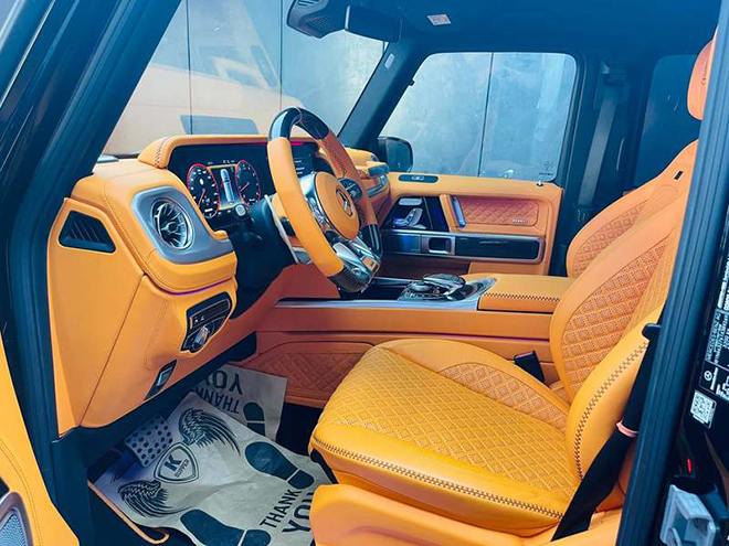 Bên trong khoang cabin, Mercedes-AMG G63 Brabus 800 Widestar sở hữu nội thất bọc da màu cam vô cùng nổi bật, kết hợp nhiều chi tiết được ốp sợi carbon. Hàng ghế sau có thêm 2 màn hình giải trí lớn được gắn trên tựa đầu phía sau của hàng ghế trước.