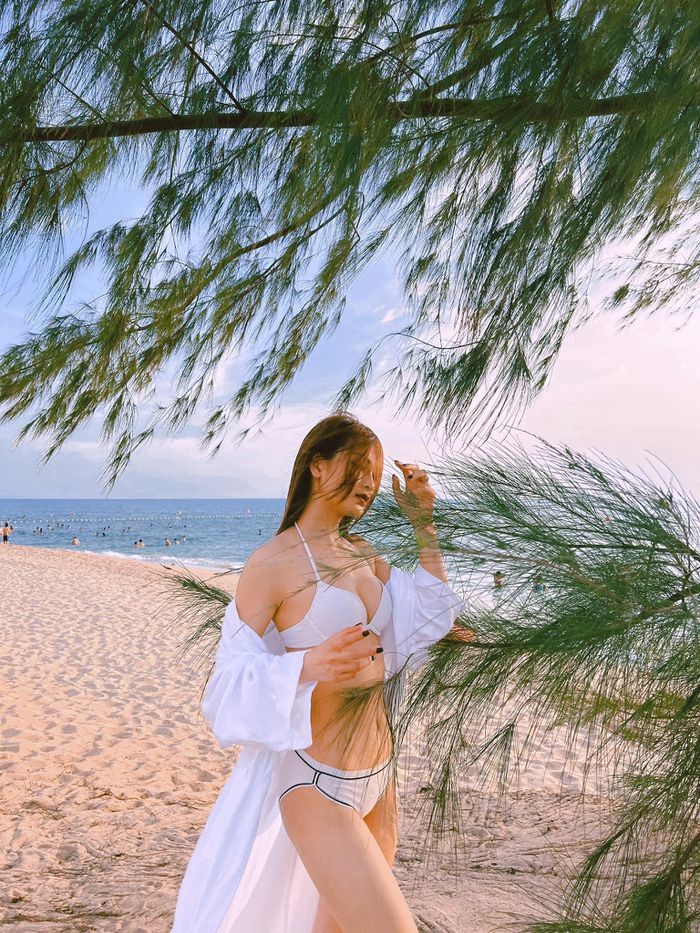 Chia sẻ về loạt ảnh, Huyền Trang lém lỉnh viết: "Tự nhiên đi ra đảo cái mất sóng luôn/ Không biết tương tác tim có ok không?".