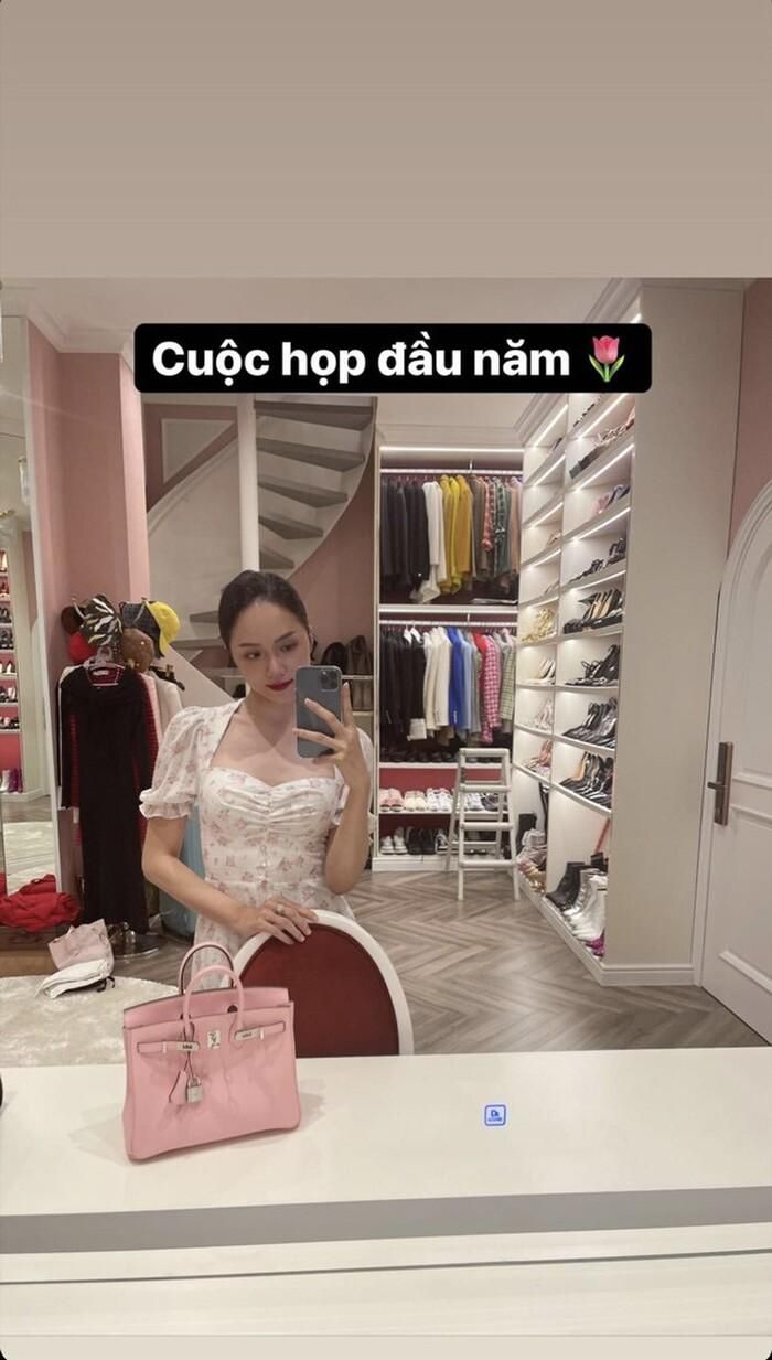 Mới đây người đẹp lần nữa khiến khán giả trầm trồ khi khoe lên story trang cá nhân outfit chuẩn bị đi họp đầu năm. Theo đó, chiếc váy nhẹ nhàng, tone màu tao nhã, ngọt ngào là trang phục được nàng Hậu lựa chọn, nhưng điểm nhấn chính thuộc về chiếc túi trị giá hơn nửa tỷ đồng từ nhà mốt Hermes và nhẫn kim cương trĩu nặng trên ngón tay kia.