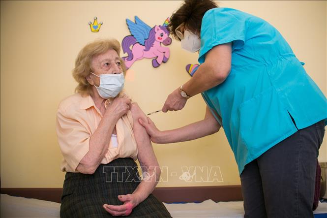 Nhân viên y tế tiêm vaccine phòng COVID-19 cho người cao tuổi tại bệnh viện Pirogov ở Sofia, Bulgaria ngày 24/2/2021. Ảnh: AFP/TTXVN