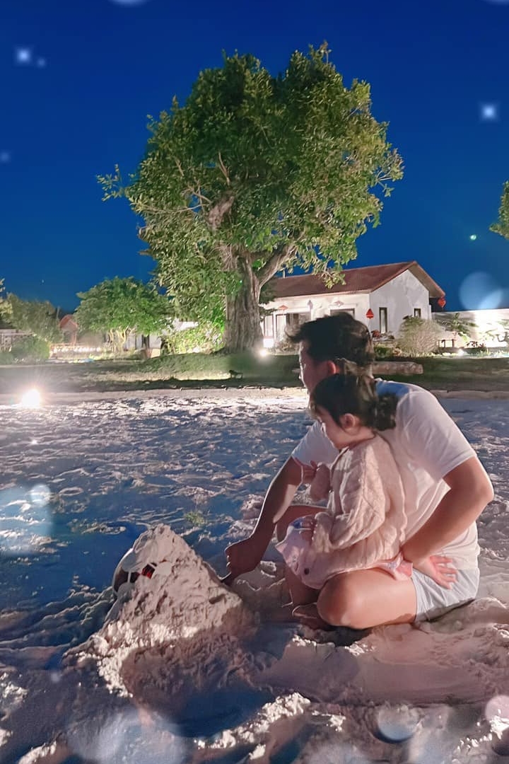 Bãi cát trắng là khu vực vui chơi yêu thích của hai bố con Trường Giang mỗi chiều tối.