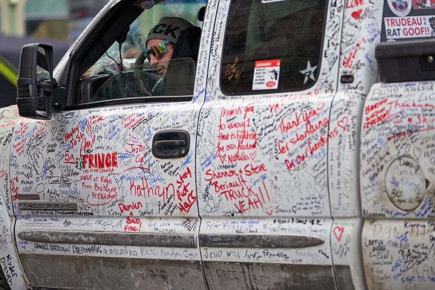 Một chiếc xe ô tô bị viết chi chít các thông điệp ủng hộ biểu tình ở Ottawa. Ảnh: Shutterstock.