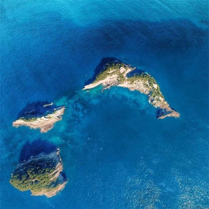 Nhìn từ trên cao, hòn đảo rất giống cá heo đang nhảy sóng, trong khi tên gọi của đảo lại có nghĩa là 'gà trống'.