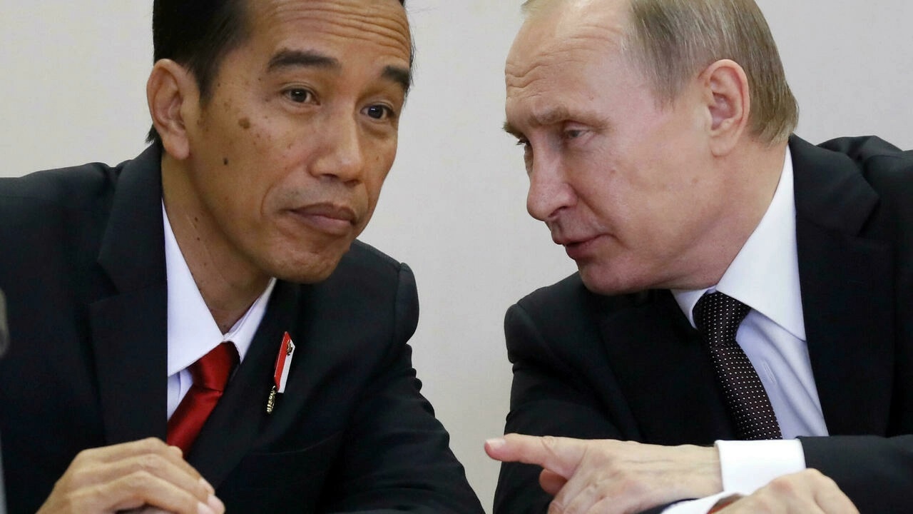 Tổng thống Nga Vladimir Putin, nói chuyện với Tổng thống Indonesia Joko Widodo sau cuộc gặp tại Sochi, Nga, ngày 18/05/2016. AP - Alexander Zemlianichenko