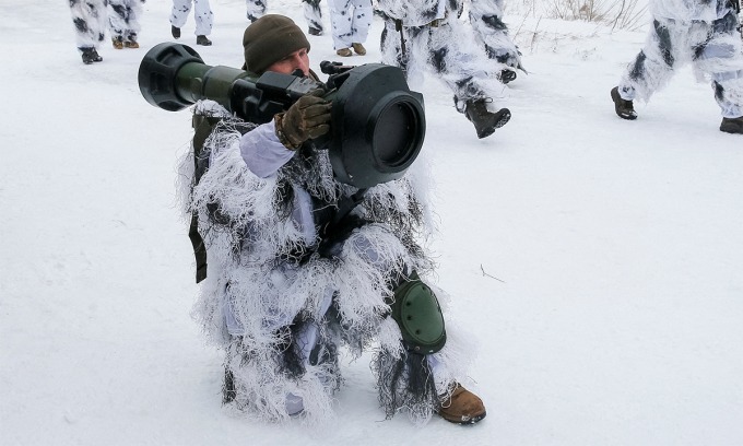 Binh sĩ Ukraine luyện tập với tên lửa chống tăng NLAW của Anh tại thao trường gần Yavoriv ngày 28/1. Ảnh: Reuters.