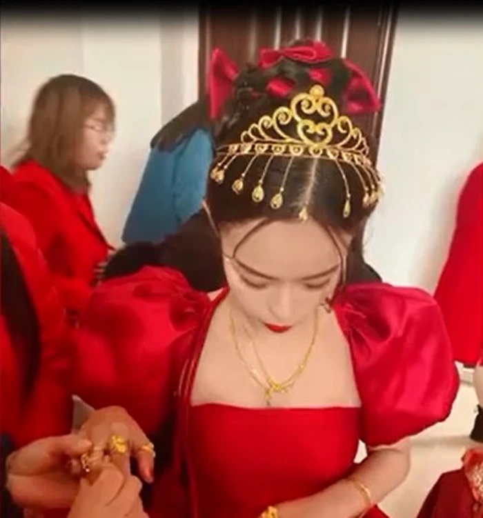 Thế nhưng, bộ trang sức cô dâu đeo trong ngày cưới lại khiến mọi người chú ý. Đoạn video đăng tải lên mạng xã hội cho thấy, cô dâu mặc áo dài đỏ, được trang điểm tinh tế, trông rất xinh đẹp.