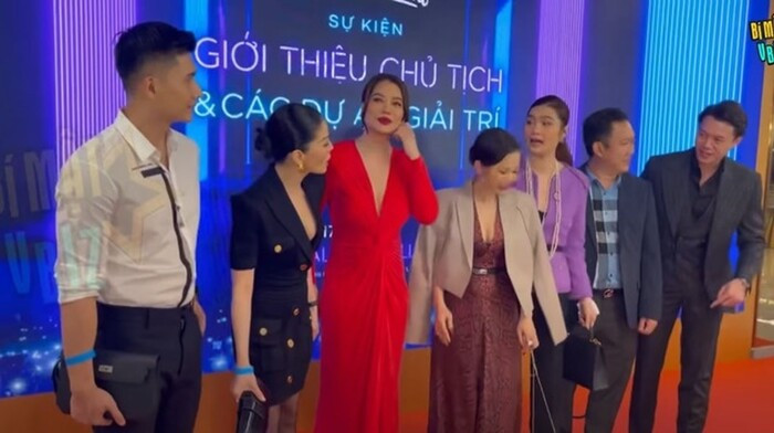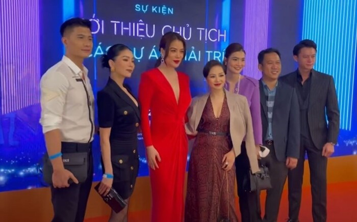 Lâm Bảo Châu liên tục ôm eo Lệ Quyên ngay trên thảm đỏ, diễn viên Anh Dũng và Trương Ngọc Ánh lại liên tục ghé tai nhau, thì thầm to nhỏ.
