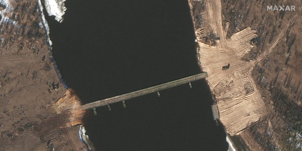Ảnh vệ tinh phát hiện lối đi bí mật quân Nga có thể sử dụng nếu tấn công Ukraine. Maxar thu thập được những bức ảnh vệ tinh mới cho thấy một cây cầu được Nga xây dựng bắc qua một con sông gần Ukraine có thể được sử dụng cho một cuộc tấn công quân sự vào Kiev.