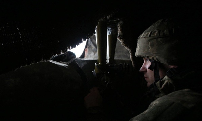 Một quân nhân Ukraine quan sát trên chiến tuyến ở Novolugansk, Donesk, miền đông Ukraine, hôm 17/2. Ảnh: AFP.