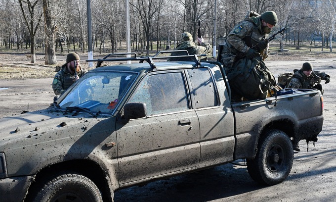 Lính Ukraine rời xe bán tải tại làng Verkhnotoretske, tỉnh Donetsk ngày 20/2. Ảnh: Reuters.