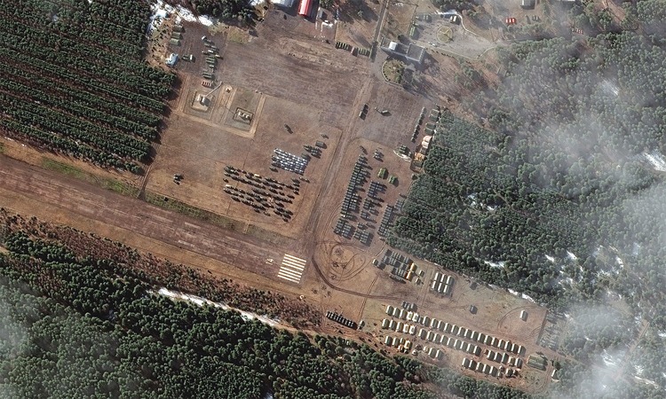 Theo ảnh vệ tinh, khoảng 100 phương tiện và hàng chục lều bạt nghi của Nga xuất hiện ở sân bay tại Belarus, cách biên giới với Ukraine 40 km.
