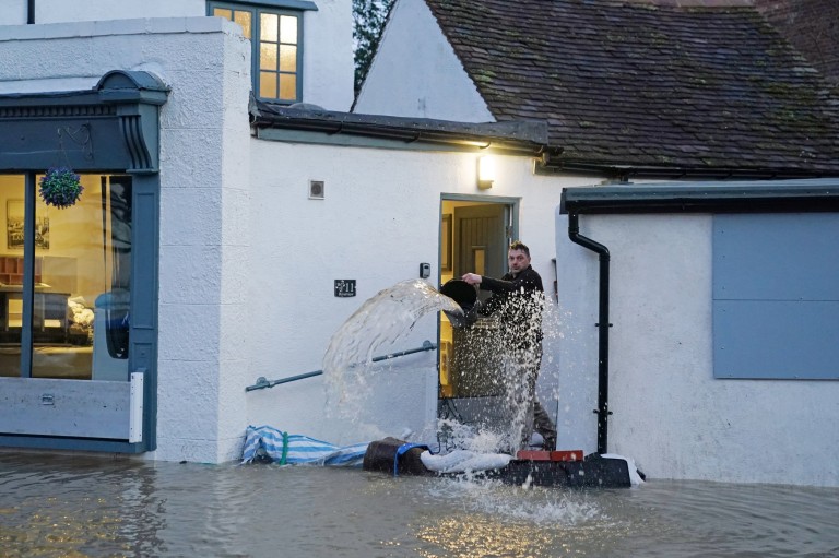 Một người đàn ông múc nước ra khỏi nhà ở Bewdley. (Ảnh: PA)