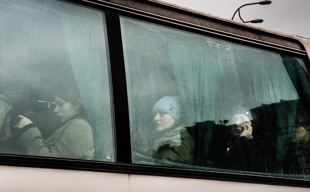 Những người trên xe bus rời Kiev ngày 24/2. Ảnh: CNN