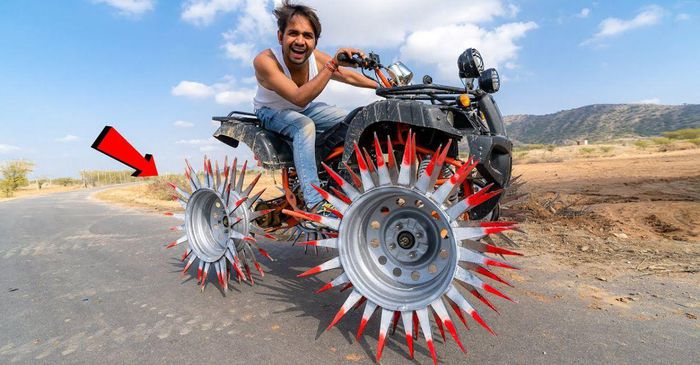Một Youtuber người Ấn Độ đã thực hiện thử nghiệm thay thế các bánh xe thông thường của chiếc xe địa hình ATV bằng các bánh xe đầy gai kim loại được hàn gắn vào vành cũng bằng kim loại.