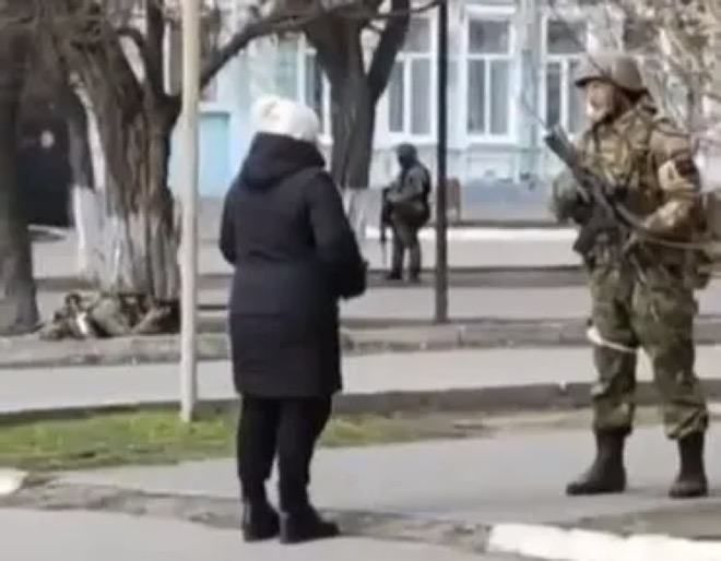 Old  Default Cảnh người phụ nữ đơn độc đối mặt binh sĩ Nga ở thành phố Ukraine