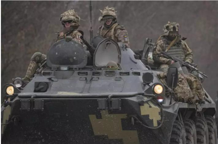 Quân nhân Ukraine ngồi trên xe tăng đang chạy trên đường ở khu vực Donetsk, miền đông Ukraine, thứ Năm, ngày 24/2. Tổng thống Nga Vladimir Putin đã mở chiến dịch quân sự ở Ukraine và cảnh báo các nước khác rằng bất kỳ nỗ lực nào nhằm can thiệp vào hành động của Nga sẽ dẫn đến "hậu quả chưa từng thấy". Ảnh AP
