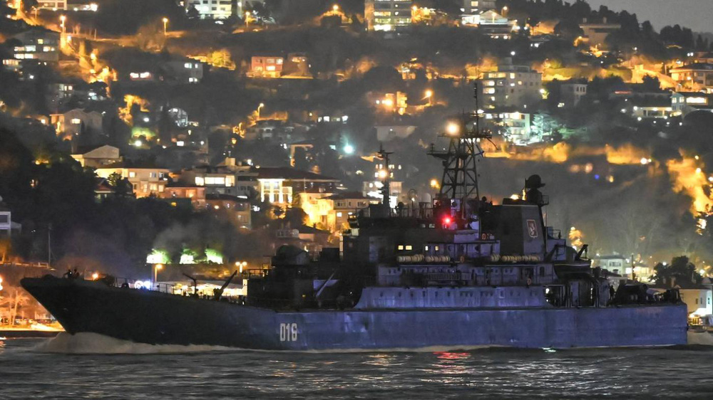 Một tàu hải quân Nga đi qua eo biển Bosphorus trên đường đến Biển Đen, qua thành phố Istanbul vào ngày 9 tháng 2 năm 2022. Ảnh: AFP
