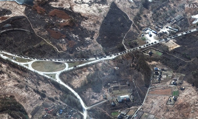 Ảnh vệ tinh cho thấy đoàn xe quân sự Nga áp sát thủ đô Kiev kéo dài khoảng 64 km, gấp hơn hai lần độ dài trong ảnh chụp trước đó.