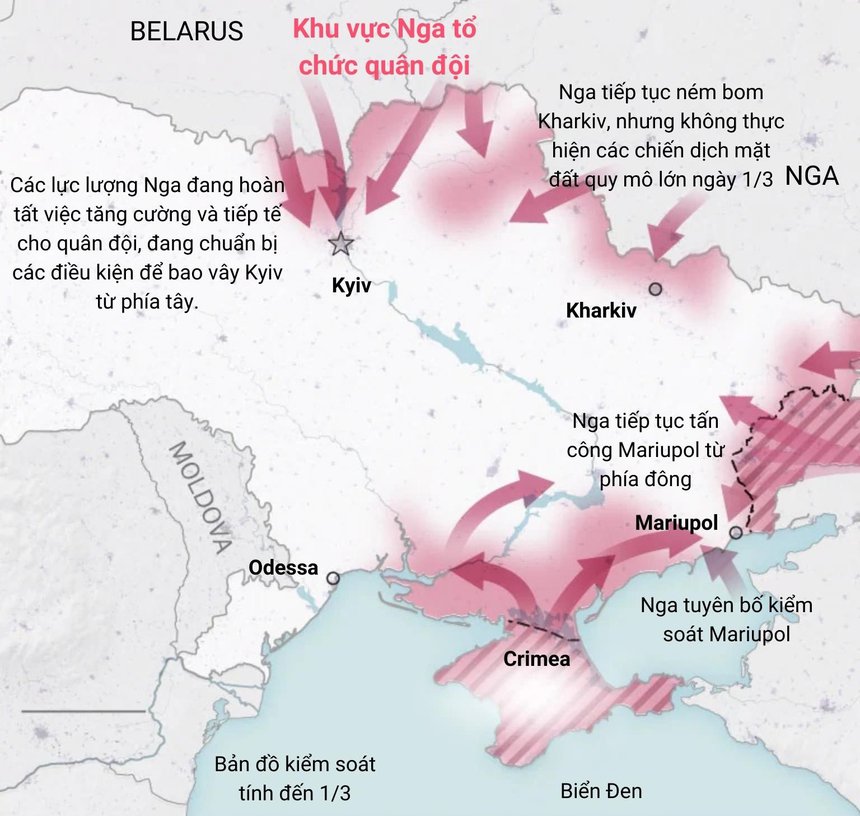 Tình hình cuộc tấn công của Nga vào Ukraine ngày 1/3. Đồ họa: Washington Post.