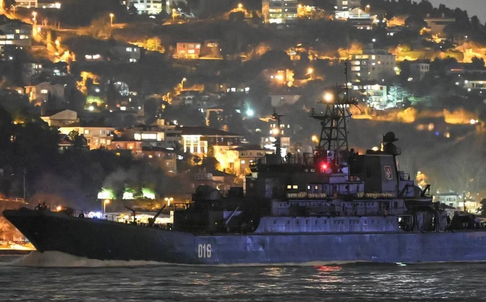 Một tàu hải quân Nga đi qua eo biển Bosphorus trên đường đến Biển Đen, qua thành phố Istanbul vào ngày 9 tháng 2 năm 2022. Ảnh: AFP