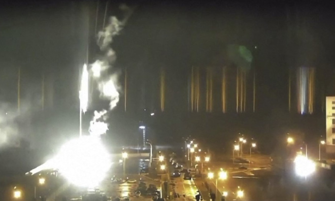 Pháo sáng rơi bên ngoài nhà máy Zaporizhzhia trong giao tranh hôm 4/3. Ảnh: AFP.