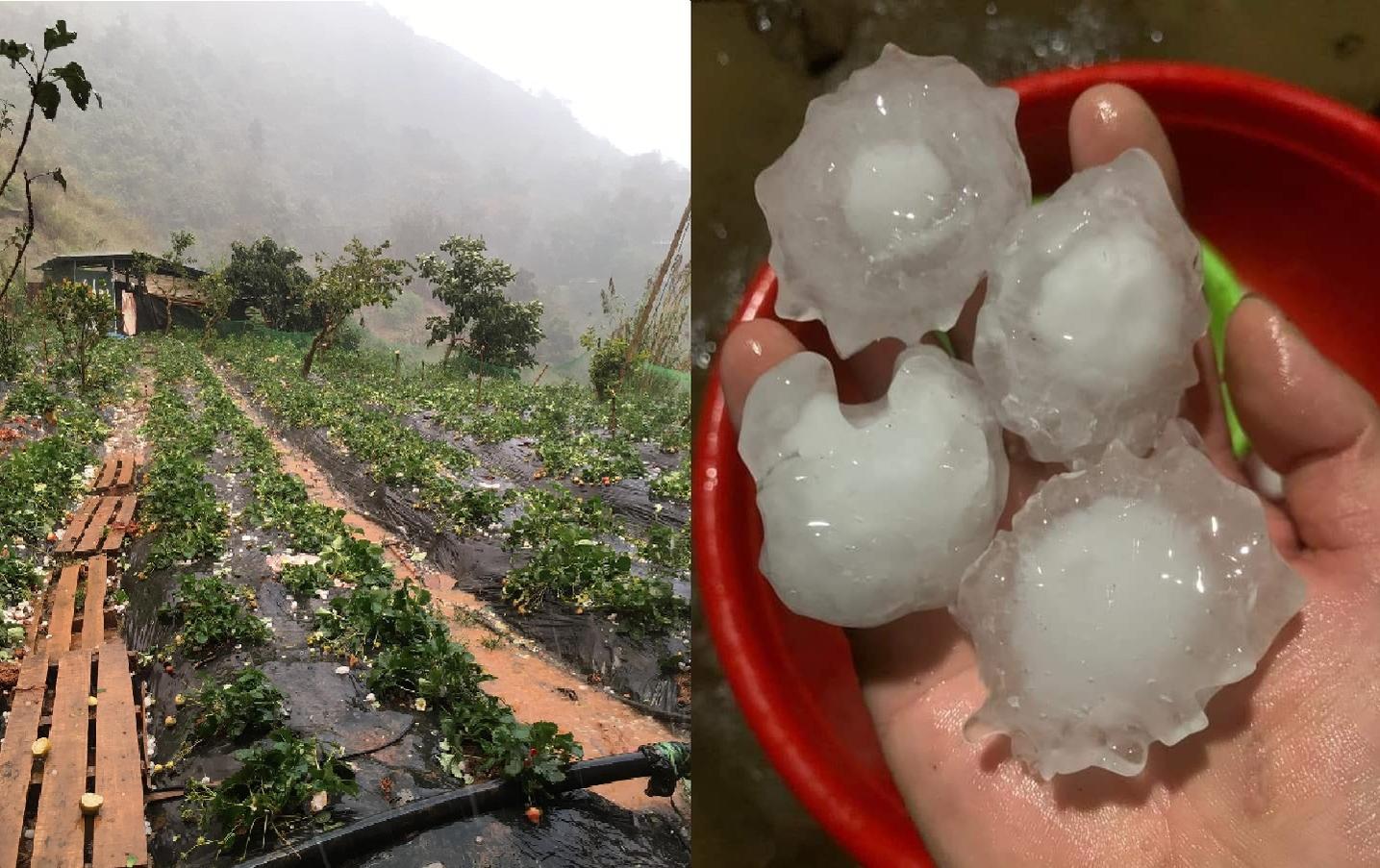 Mưa đá khiến một số diện tích dâu tây, hoa màu, mái nhà lợp fibro ximăng... của người dân bị thiệt hại.