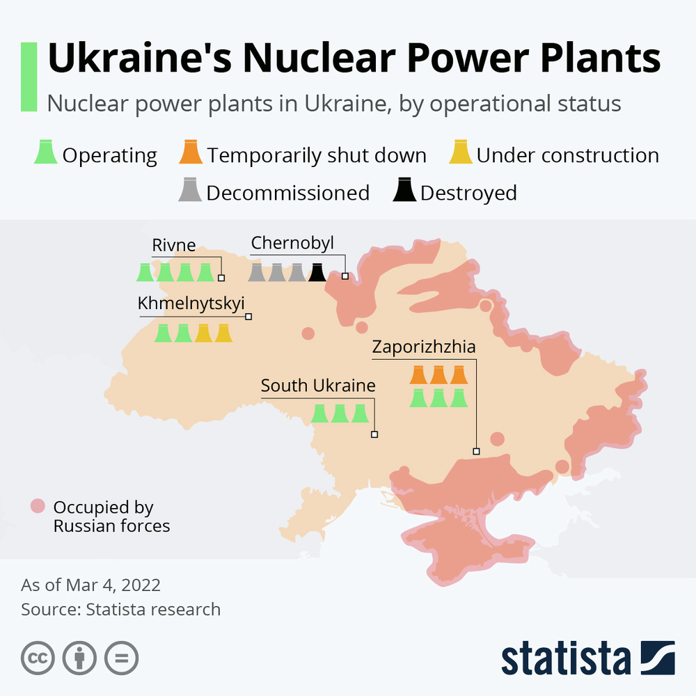 Mới đây, liên tiếp 2 nhà máy điện hạt nhân của Ukraine đã nằm trong sự kiểm soát của quân đội Nga là Chernobyl và Zaporizhzhia, và hiện quân đội Nga được cho là đang hướng tới nhà máy Yuzhnoukrainsk theo lời của Tổng thống Ukraine - Volodymyr Zelensky.