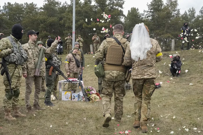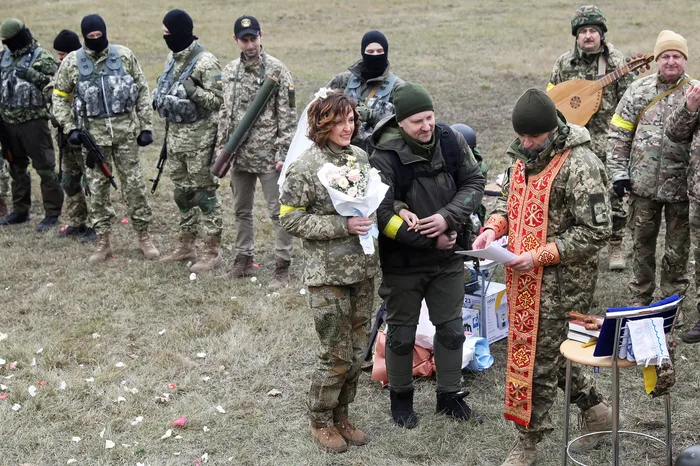 Theo như có một cặp đôi nam nữ đã không gặp nhau kể từ khi cuộc xung đột với Nga nổ ra vào cuối tháng trước. Họ gia nhập lực lượng dự bị quân sự “bởi vì ở nơi đây chúng tôi có tất cả những gì chúng tôi yêu quý và chúng tôi phải bảo vệ đất nước mình”, vì vậy cặp đôi này rạng ngời trong đám cưới giản đơn ngay trên chiến tuyến.