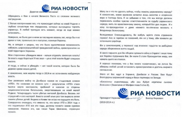 Hãng tin RiaNovosti ngày 8/3 đăng tải bức thư được viết bằng tiếng Nga và tiếng Ukraine, được cho là của cựu Tổng thống Ukraine Viktor Yanukovych gửi Tổng thống Ukraine đương nhiệm, trong đó khuyên ông Zelensky "ngăn chặn đổ máu bằng bất cứ giá nào và đạt được một thỏa thuận hòa bình".