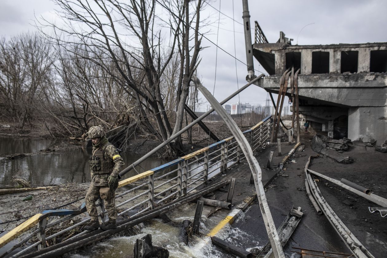 Dân thường đã chạy trốn các cuộc giao tranh ở Irpin, thị trấn ở ngoại ô Kiev hiện do lực lượng đặc nhiệm Ukrain chốt chặn, chống lại các cuộc tấn công của Nga. Ảnh The Wall Street Journal.