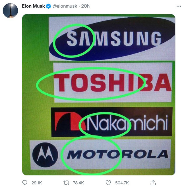 Bức ảnh mà vị tỷ phú công nghệ đăng tải là tên của 4 tập đoàn công nghệ nổi tiếng thế giới là Samsung, Toshiba, Nakamichi, Motorola. Khi ghép những ký tự đầu tiên của mỗi thương hiệu, cái tên Satoshi Nakamoto sẽ hiện ra.