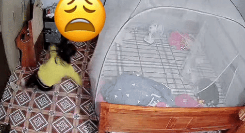 Cụ thể, vụ việc được camera trong phòng ngủ ghi lại hình ảnh một em bé khoảng gần 2 tuổi đang chơi trên giường, quanh giường là một chiếc màn khung bao phủ.