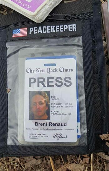 Hình ảnh do phía Ukraine công bố cho thấy Renaud mang theo thẻ tác nghiệp của New York Times, nhưng tờ báo Mỹ khẳng định đây là thẻ dành cho những đợt hợp tác trước đây với phóng viên, lần gần nhất vào năm 2015.