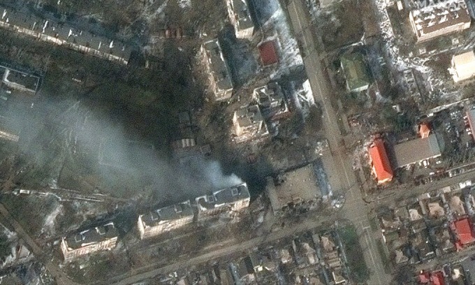 Khói bốc lên từ một khu nhà ở Mariupol, miền nam Ukraine, trong ảnh vệ tinh hôm 12/3. Ảnh: AFP.