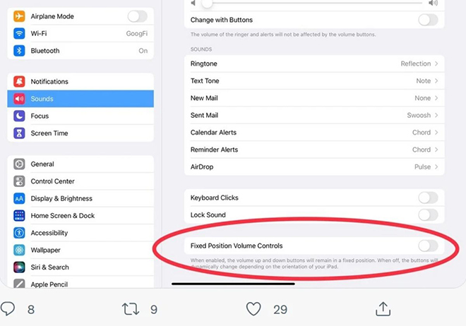 Để truy cập nút bật tắt, với iPad đang chạy iPadOS 15.4, người dùng hãy vào Settings > Sounds > Toggle off Fixed Position Volume Controls. Khi tắt nút này, nút tăng âm lượng (+) sẽ ở bên phải hoặc trên cùng bất kể người dùng đang cầm iPad như thế nào. Và nút giảm âm lượng (-) sẽ vẫn ở bên trái hoặc dưới cùng bất kể iPad đang được giữ ở chế độ ngang hay dọc.