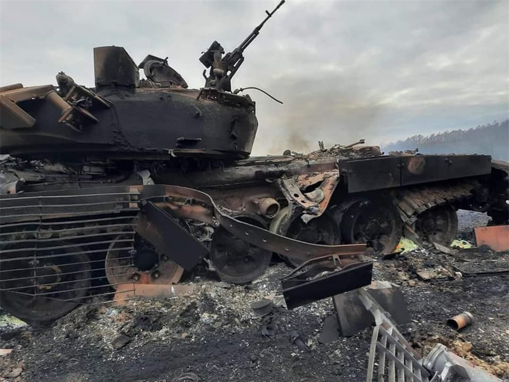 Xe tăng Nga bị phá hủy gần Priluky, Ukraine. Ảnh: Twitter